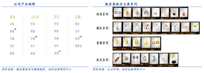經(jīng)典案例:根據(jù)潮宏基珠寶天貓旗艦店、公司官網(wǎng)、安信證券研究中心等綜合資訊表明,潮宏基品牌已經(jīng)形成了時尚、婚慶、童趣和高定四大系列來滿足不同客群的需求。每個系列下包含吊墜、項鏈、手鏈、戒指、耳飾、手鐲、串珠這七大品類;材質(zhì)上除了主推的 K 金外,涵蓋黃金、鉆石、鉑金、珍珠以及彩寶等。以各大珠寶品牌的天 貓旗艦店為例,2022 年 3 月潮宏基珠寶 SKU 達(dá) 2667 個,僅次于周大福位居行業(yè)第二。