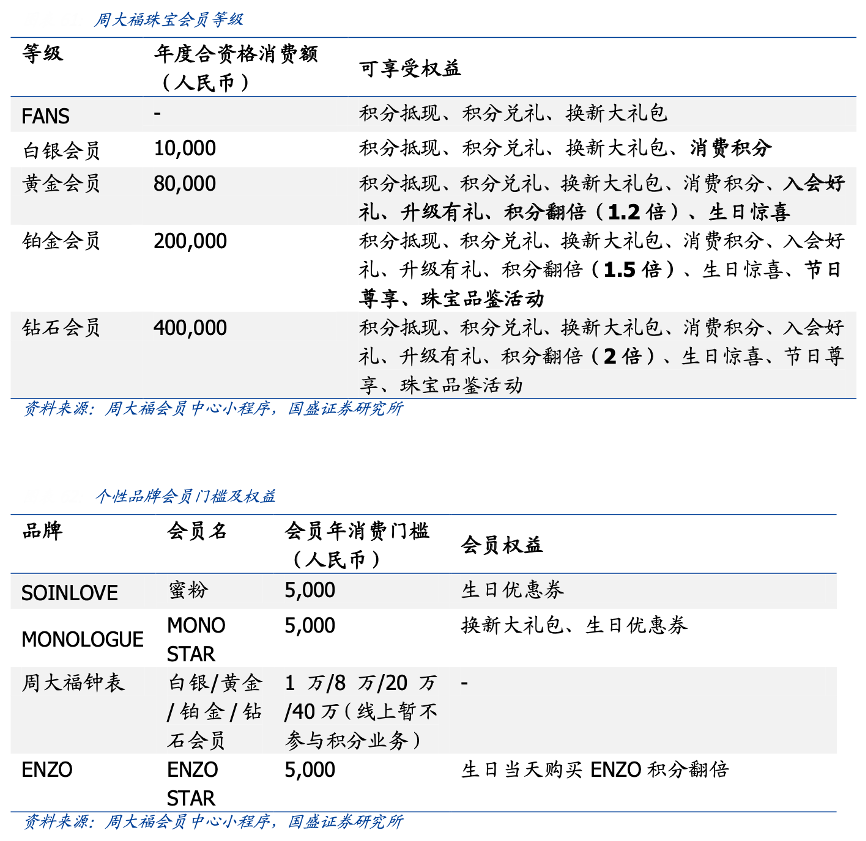 經(jīng)典案例:根據(jù)周大福會員中心小程序、國盛證券研究所等綜合資訊表明,周大福公司為會員準(zhǔn)備了專屬福利,會員可受邀參加 Good Living Plus(GLP+)會員計劃,以享受額外的獎賞優(yōu)惠,包括在與公司合作的商戶取得休閑、酒店與旅游優(yōu)惠。此外,客戶按照消費金額可享受不同級別的會員計劃,隨著會員級別的升高,會員將享有更多權(quán)利,包括積分抵現(xiàn)、積分翻倍、生日驚喜、節(jié)日尊享等,“鉑金會員”及“鉆石 會員”還有機(jī)會參與公司組織的線下高端沙龍和高端珠寶拍賣會活動。與此同時,顧客通過在個性化品牌店消費還可以獲得個性品牌專屬會員。