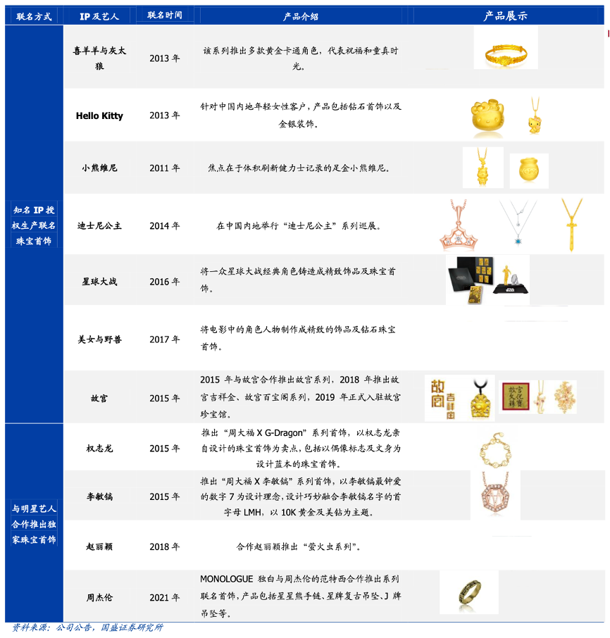 經(jīng)典案例:根據(jù)公司公告、國(guó)盛證券研究所等綜合資訊表明,周大福與迪士尼、Hello Kitty、故宮等多家知名 IP 進(jìn)行聯(lián)名,推出相關(guān)產(chǎn)品,并與明星藝人進(jìn)行合作,利用微信等社交媒體推出獨(dú)家珠寶產(chǎn)品,吸引粉絲購(gòu)買。