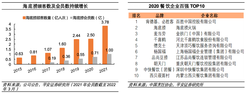 經(jīng)典案例:根據(jù)公司公告、中國(guó)烹飪協(xié)會(huì)、平安證券研究所等綜合資訊表明,海底撈公司依托“連住利益,鎖住管理”的理念及模式全面激發(fā)員工積極性,以優(yōu)質(zhì)的產(chǎn)品和極致的服務(wù)在行業(yè)中獨(dú)樹一幟,贏得良好的市場(chǎng)口碑。其客流基礎(chǔ)龐大,2021年服務(wù)人次超 3.78 億,截至 2022 年 3 月注冊(cè)會(huì)員數(shù)超 1 億,并榮登 2020 年中國(guó)餐飲百?gòu)?qiáng)榜單第二名。