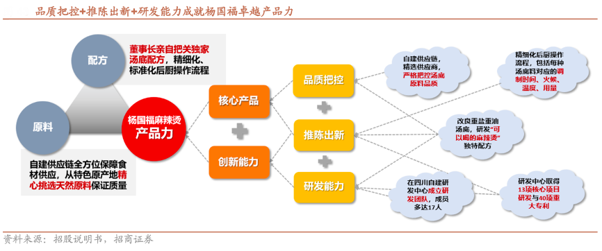 經(jīng)典案例:根據(jù)招股說(shuō)明書(shū)、招商證券等綜合資訊表明,為打破消費(fèi)者對(duì)于麻辣燙的刻板印象,楊國(guó)福公司以健康為價(jià)值觀核心,創(chuàng)新性地在麻辣燙湯底中加入全脂奶粉以及牛骨粉等營(yíng)養(yǎng)成分,為人體穩(wěn)定提供鈣元素、脂肪、維生素、礦物質(zhì)等人體必需的微量元素,研發(fā)出“可以喝的麻辣燙”的獨(dú)特配方。此外,其還堅(jiān)持順應(yīng)市場(chǎng)趨勢(shì)優(yōu)化現(xiàn)有配方并進(jìn)行產(chǎn)品推陳出新,分別于 2019 年 6 月以及 2020 年 5 月推出了“番茄麻辣湯”以及“醇香麻辣燙”兩大湯底,進(jìn)一步豐富了其產(chǎn)品矩陣。