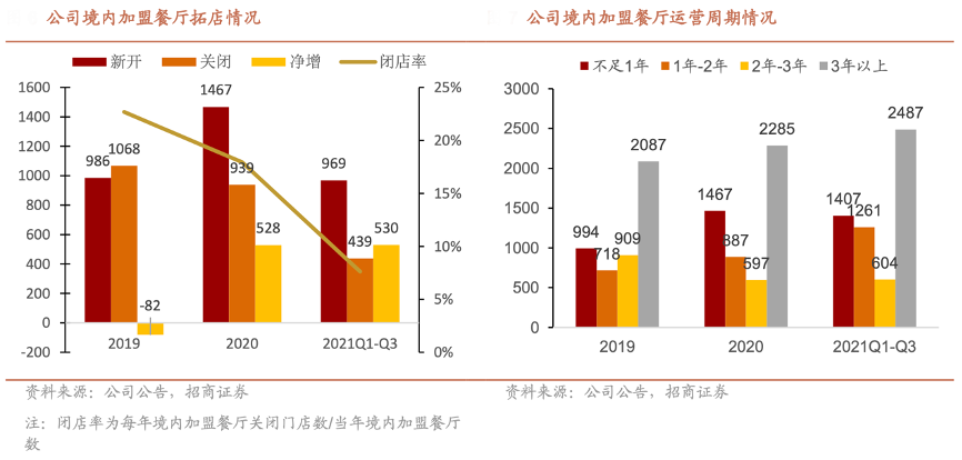 經(jīng)典案例:根據(jù)公司公告、招商證券等綜合資訊表明,疫情期間楊國(guó)福公司開(kāi)店節(jié)奏加快,閉店率大幅度下滑,近四成以上加盟餐廳運(yùn)營(yíng)周期超過(guò) 3 年。2019-2020 年及 2021 年 Q1-Q3 其公司新開(kāi)門店 986 家/1467 家/969 家,關(guān)閉門店 1068 家/939 家/439 家,目前公司已經(jīng)與部分 加盟商建立穩(wěn)定長(zhǎng)期穩(wěn)固的合作關(guān)系,4 成以上加盟餐廳運(yùn)營(yíng)周期超過(guò) 3 年。
