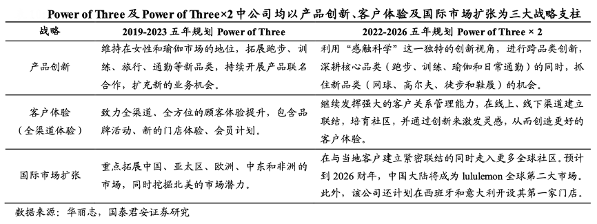 經(jīng)典案例:根據(jù)華麗志、國(guó)泰君安證券研究等綜合資訊表明,2022 年 4 月 20 日,lululemon公司官宣 2022-2026 年的五年規(guī)劃 Power of Three×2。新規(guī)劃中公司仍將堅(jiān)持產(chǎn)品創(chuàng)新、客戶體驗(yàn)及國(guó)際化擴(kuò)張三大關(guān)鍵戰(zhàn)略,計(jì)劃FY2026 實(shí)現(xiàn)營(yíng)收 125 億美元(較 FY2021 翻 倍),男裝和數(shù)字業(yè)務(wù)營(yíng)收較 FY2021 翻倍,國(guó)際市場(chǎng)營(yíng)收較 FY2021 實(shí)現(xiàn)四倍增長(zhǎng)。