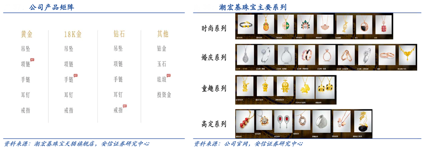 經(jīng)典案例:根據(jù)潮宏基珠寶天貓旗艦店、公司官網(wǎng)、安信證券研究中心等綜合資訊表明,潮宏基消費(fèi)群體偏年輕,且悅己需求占比較大,其品牌已經(jīng)形成了時尚、婚慶、童趣和高定四大系列來滿足不同客群的需求。每個系列下包含吊墜、項(xiàng)鏈、手鏈、戒指、耳飾、手鐲、串珠這七大品類;材質(zhì)上除了主推的 K 金外,涵蓋黃金、鉆石、鉑金、珍珠以及彩寶等。以各大珠寶品牌的天貓旗艦店為例,2022 年 3 月潮宏基珠寶 SKU 達(dá) 2667 個,僅次于周大福位居行業(yè)第二。