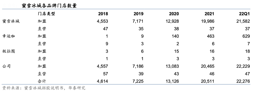 經(jīng)典案例:根據(jù)蜜雪冰城招股說(shuō)明書、華泰研究等綜合資訊表明,蜜雪冰城公司以直營(yíng)為引導(dǎo),加盟為主體進(jìn)行擴(kuò)張。直營(yíng)門店由公司直接設(shè)立,享受門店銷售商品收益、承擔(dān)門店開(kāi)支;加盟門店由公司進(jìn)行審核批準(zhǔn),公司向加盟商收取固定的加盟費(fèi)/管理費(fèi)/培訓(xùn)費(fèi)等及向加盟商提供食材/設(shè)備/運(yùn)營(yíng)指導(dǎo)等。蜜雪冰城主要以加盟模式進(jìn)行擴(kuò)張,截至 22Q1,全國(guó)共有 22,276 家門店,其中 22,229 家為加盟門店。