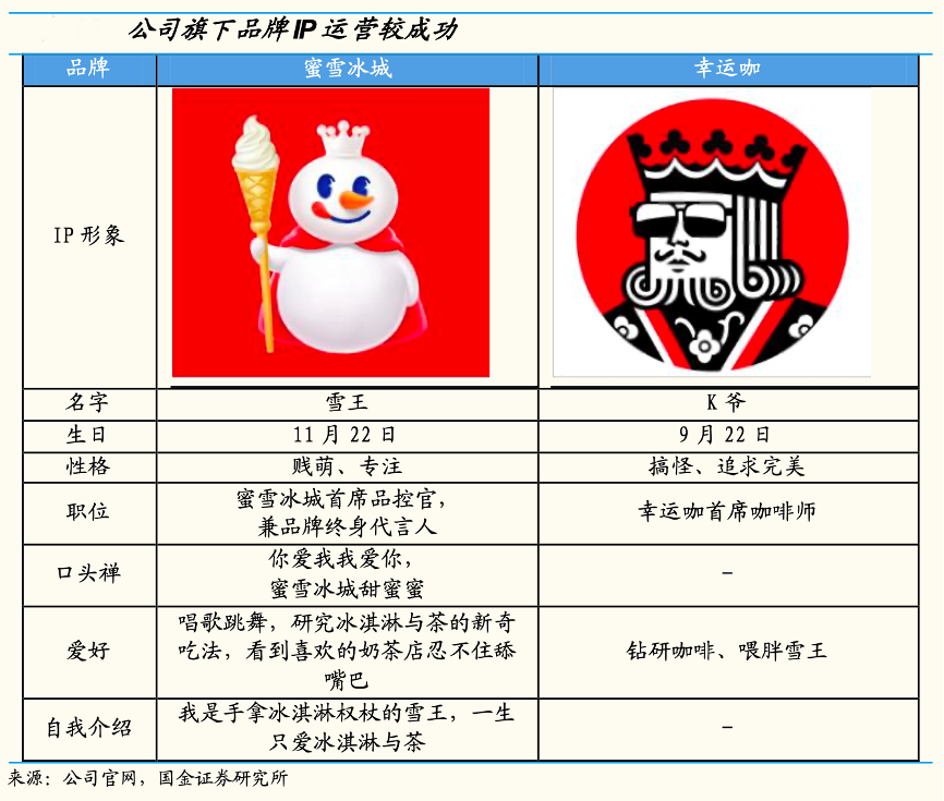經(jīng)典案例:根據(jù)公司官網(wǎng)、國(guó)金證券研究所等綜合資訊表明,蜜雪冰城人格化 IP“雪王”營(yíng)銷成功,2021年洗腦廣告曲傳播進(jìn)一步推升品牌知名度。從經(jīng)驗(yàn)上看,人格化 IP 的成功塑造有助于形成品牌與消費(fèi)者間的情感鏈接、提升品牌黏性。