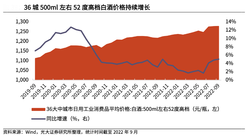 經典案例:根據Wind、光大證券研究所等綜合資訊表明,2022 年 8 月 36 城高端白酒 500ml 左右 52 度平均價為1277.28 元/瓶,同比增長 5.0%。 高端白酒兼具飲用、收藏和社交價值,具有較好的保值功能,推動高端白酒平均 價近 3 年持續(xù)保持同比正增長的趨勢。白酒品牌分化 凸顯,市場份額向高端白酒集中,進一步推動高端白酒的價值增長。