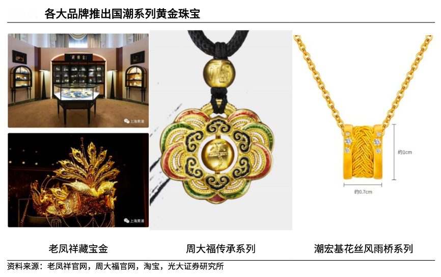 經典案例:根據老鳳祥官網、周大福官網、淘寶、光大證券研究所等綜合資訊表明,各大黃金珠寶品牌均注重結合中國傳統(tǒng)文化進行新品設計,推出了一系列國潮風格的黃金珠寶。例如,老鳳祥在 2022 年 9 月舉辦“老鳳祥藏寶金”首發(fā)儀式,展現主題產品“繡風華”、“青綠國色”等系列;周大福的傳承系列的成功是其 FY2022 黃金首飾及產品營業(yè)額提升的重要推動;潮宏基也在 2022 年 4 月推出了花絲風雨橋系列,受到廣泛歡迎。
