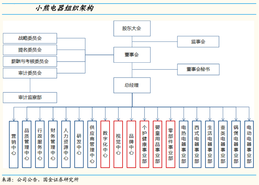 經(jīng)典案例:根據(jù)公司公告、國金證券研究部等綜合資訊表明,2021年12月小熊電器公司為優(yōu)化管理提升效率,對組織架構(gòu)進(jìn)行調(diào)整,本輪調(diào)整主要新增“數(shù)字化中心”、“ 視覺中心”、“品牌中心”,此輪調(diào)整為公司品牌戰(zhàn) 略升級規(guī)劃打好內(nèi)部底層建筑,數(shù)字化中心突顯公司對數(shù)字化能力構(gòu)建的重視,視覺中心有助于更好助推產(chǎn)品精品化策略。