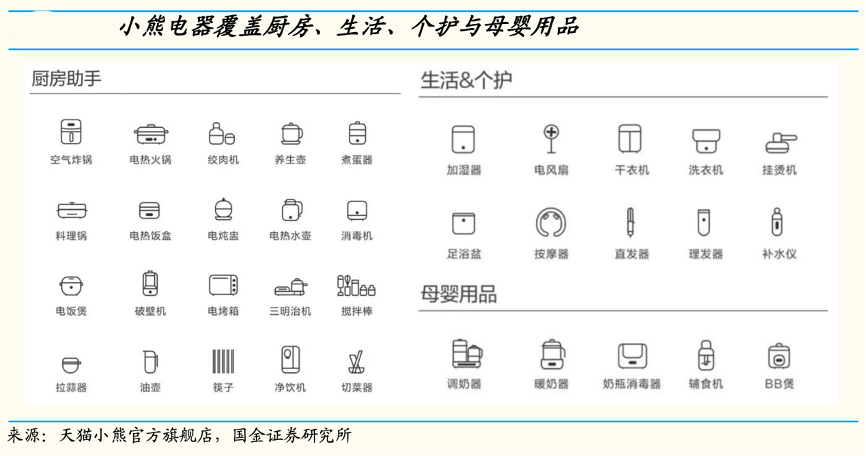經(jīng)典案例:根據(jù)天貓小熊官方旗艦店、中信證券研究部等綜合資訊表明,小熊以酸奶機(jī)起家,發(fā)展至今覆蓋廚房小家電、生活小家電和其他小家電,產(chǎn)品超 60 個品類,已基本覆蓋各類主流剛需與長尾創(chuàng)意小家電產(chǎn)品。目前小熊在長 尾品類優(yōu)勢突出,煮蛋器、酸奶機(jī)、電熱飯盒、電烤爐、打蛋器、吐司機(jī)等品類份額居前。