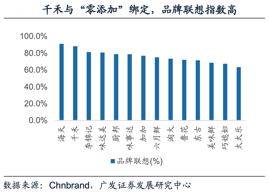 經(jīng)典案例:根據(jù)Chnbrand、廣發(fā)證券發(fā)展研究中心等綜合資訊表明,海天是唯一全國(guó)性調(diào)味品品牌,品牌影響力在行業(yè)內(nèi)處于絕對(duì)第一位,其他品牌均為區(qū)域性品牌。根據(jù)Chnbrand,2021年千禾“品牌聯(lián)想”達(dá)88.1%,位于行業(yè)第2位,即在消費(fèi)者心目中,海天等于醬油、千禾等于零添加,說(shuō)明公司與“零添加”概念綁定較深、品牌粘性較強(qiáng),市場(chǎng)教育初見成效。