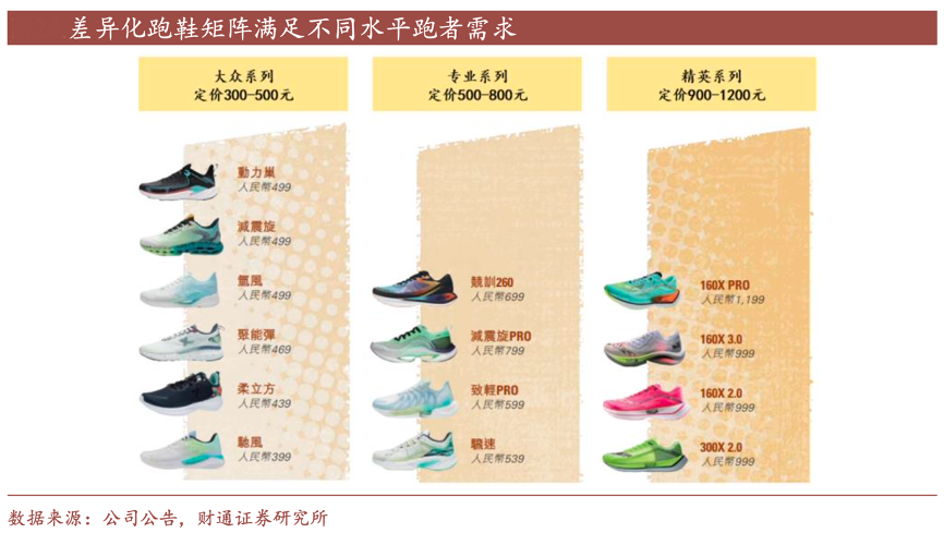 經(jīng)典案例:根據(jù)公司公告、財(cái)通證券研究所等綜合資訊表明,特步三大系列可以滿(mǎn)足不同專(zhuān)業(yè)度、 不同消費(fèi)能力的跑者需求,實(shí)現(xiàn)對(duì)客群較為全面的覆蓋。其中針對(duì)專(zhuān)業(yè)競(jìng)賽級(jí)跑者,公司推出推進(jìn)力、回彈、減震性能較高的精英系列跑鞋,定位 900 元以上價(jià)格帶。