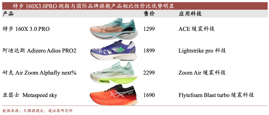 經(jīng)典案例:根據(jù)天貓旗艦店、財(cái)通證券研究所等綜合資訊表明,在特步戰(zhàn)略升級(jí)發(fā)布會(huì)上,根據(jù) 36Kr 對(duì) SGS 專(zhuān)業(yè)檢測(cè)報(bào)告的分析,特步 160X 3.0 PRO 跑鞋的減震/耐磨/防滑性能較耐克 Air Zoom Alphafly next%高6%/21%/12%,在性能方面的關(guān)鍵指標(biāo)已經(jīng)可以比肩甚至超越國(guó)際品牌旗艦產(chǎn)品的前提下,其價(jià)格遠(yuǎn)低于國(guó)際品牌,性?xún)r(jià)比優(yōu)勢(shì)明顯。