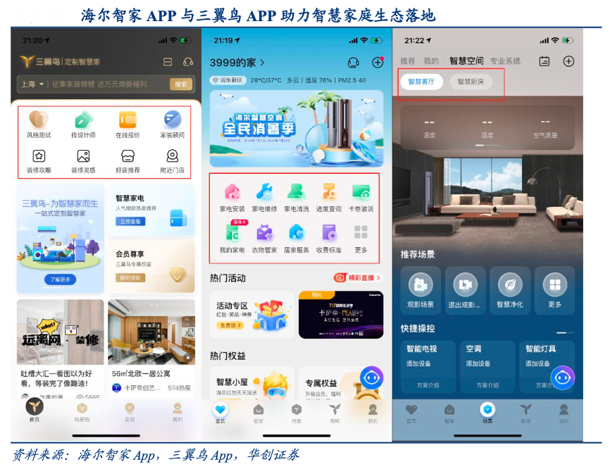 經(jīng)典案例:根據(jù)海爾智家APP、三翼鳥APP、華創(chuàng)證券等綜合資訊表明,海爾公司先后推出海爾智家App與三翼鳥App,用戶可通過線上服務(wù)管家對接需求,在實體店體驗后可通過 App 直接下單,實現(xiàn)線上線下銷售一體化;場景落地后亦可在 App 上操控全屋不同產(chǎn)品的智慧功能,以及預(yù)約清洗、維修等全流程服務(wù)。