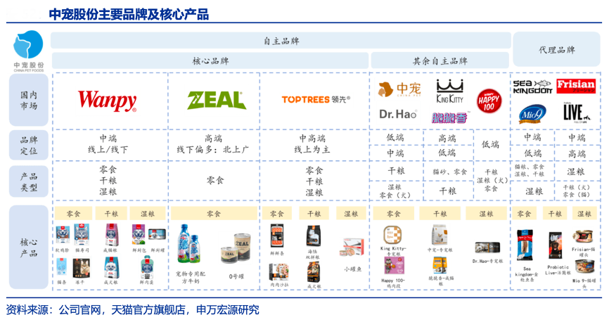 經典案例:根據公司官網、天貓官方旗艦店、申萬宏源研究等綜合資訊表明,中寵股份公司將三大核心自主品牌采用差異化品牌定位,頑皮為大眾品牌,定位中端,產品品類最廣,以“鮮”為品牌標簽;Zeal 為高端品牌,定位一線城市,以“新西蘭原裝進口”、“天然”為核心賣點;領先為互聯網中高端品牌,以線上渠道為主要發(fā)力點,在穩(wěn)固線上優(yōu)勢的同時,逐步進行線下渠道的擴張。