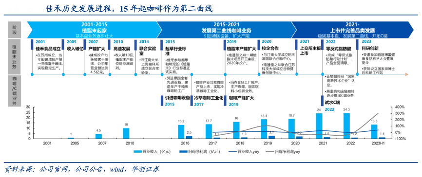 經(jīng)典案例:根據(jù)公司官網(wǎng)、公司公告、wind、華創(chuàng)證券等綜合資訊表明,恰逢國內(nèi)咖啡品牌興起,認識到產(chǎn)業(yè)趨勢后,佳禾公司 2015 年立足咖啡第二曲線,當前已搭建起咖啡全套應用解決方案。2021 年上市后著手 C 端燕麥奶&牛乳茶發(fā)展。2022年公司收入 24.3 億元,歸母凈利 1.2 億元,植脂末恢復疊加咖啡起量,2023年來收入提速。