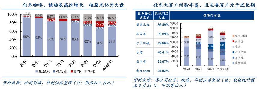 經(jīng)典案例:根據(jù)公司財報、各公司公告、極海、華創(chuàng)證券等綜合資訊表明,植脂末性價比高且口感好,廣泛應用于咖啡和奶茶,行業(yè)整體成熟,但佳禾份額僅占 14%,投產(chǎn)后預計達 20%,行業(yè)其他均為中小企業(yè),佳禾定制化服務能力強,主要客戶處于成長期,是基本盤業(yè)務。