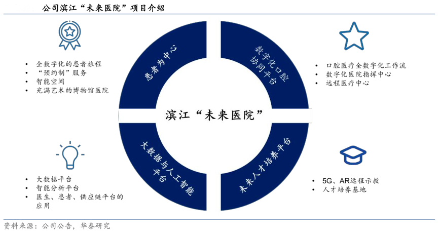 經(jīng)典案例:根據(jù)公司公告、華泰研究等綜合資訊表明,紫金港醫(yī)院是通策醫(yī)療公司重點(diǎn)布局的頭面部醫(yī)學(xué)中心,其定位以口腔醫(yī)療服務(wù)為主,兼有疾病預(yù)防、保健、科研、教學(xué)等多種功能,濱江未來醫(yī)院亦為公司完善杭州區(qū)域布局的重點(diǎn)項目,其以未來口腔醫(yī)院為標(biāo)準(zhǔn)進(jìn)行建設(shè),從客戶的預(yù)約、復(fù)診、就診路線等就診的各個環(huán)節(jié)都將實現(xiàn)數(shù)字信息化,并借助大數(shù)據(jù)平臺及人工智能平臺,為醫(yī)院運(yùn)營情況及客戶診療結(jié)果提供綜合分析,該院建成后將新增牙椅 43 張。