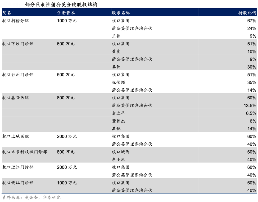 經(jīng)典案例:根據(jù)公司公告、華泰研究等綜合資訊表明,通策醫(yī)療公司于 2018 年底正式啟動“蒲公英計劃”,從建設(shè)模式看,各新建分院由公司(通過杭口集團(tuán)持股 51%及以上)、杭口總院醫(yī)生集團(tuán)(持 股約 9-20%)和當(dāng)?shù)蒯t(yī)生團(tuán)隊(持股約 30-40%)共同出資,其中公司為分院提供品牌、技術(shù)、管理等基礎(chǔ)支持,總院醫(yī)生集團(tuán)為分院提供專家等核心支持,當(dāng)?shù)貓F(tuán)隊為分院提供醫(yī)護(hù)人員等主力支持。