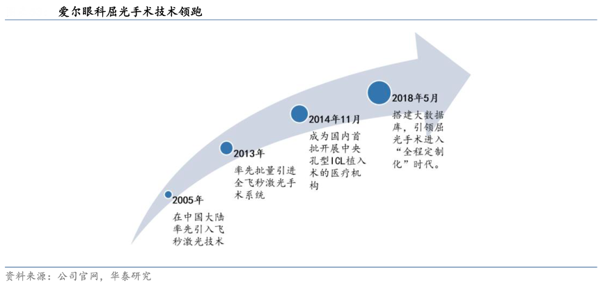 經(jīng)典案例:根據(jù)公司官網(wǎng)、華泰研究等綜合資訊表明,愛爾眼科公司作為國(guó)內(nèi)民營(yíng)眼科診療服務(wù)領(lǐng)軍者,持續(xù)引領(lǐng)屈光手術(shù)相關(guān)先進(jìn)技術(shù)在國(guó)內(nèi)的導(dǎo)入和應(yīng)用;比如公司在 2005 年率先在國(guó)內(nèi)引入飛秒激光技術(shù),在 2013 年率先批量引進(jìn)全飛秒激光手術(shù)系統(tǒng),在 2014 年又成為國(guó)內(nèi)首批開展中央孔型 ICL 植入術(shù)的醫(yī)療機(jī)構(gòu)。