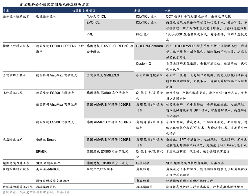 經(jīng)典案例:根據(jù)武漢愛爾眼科醫(yī)院官網(wǎng)、華泰研究等綜合資訊表明,愛爾眼科公司目前引進(jìn)了包括德國(guó)鷹視FS200 飛秒激光、德國(guó)蔡司 VisuMax 飛秒激光、德國(guó)鷹視 EX500 準(zhǔn)分子激光、德國(guó)阿瑪仕 1050RS 全激光 系統(tǒng)在內(nèi)的各型高端設(shè)備,能夠?yàn)榛颊咛峁┌ňw植入、精雕飛秒、全飛秒、飛秒和表 層矯正等技術(shù)在內(nèi)的多樣化解決方案,真正建立了一套可匹配患者不同適應(yīng)癥(屈光不正 程度、角膜厚度、是否合并散光等)、個(gè)性化需求(術(shù)后恢復(fù)時(shí)長(zhǎng)、軍人或運(yùn)動(dòng)員等特殊人 群等)和支付能力(手術(shù)費(fèi)用從超薄準(zhǔn)分子激光的約 5000 元至雙眼 ICL 晶體植入的超 30000 元)的定制化屈光手術(shù)體系。