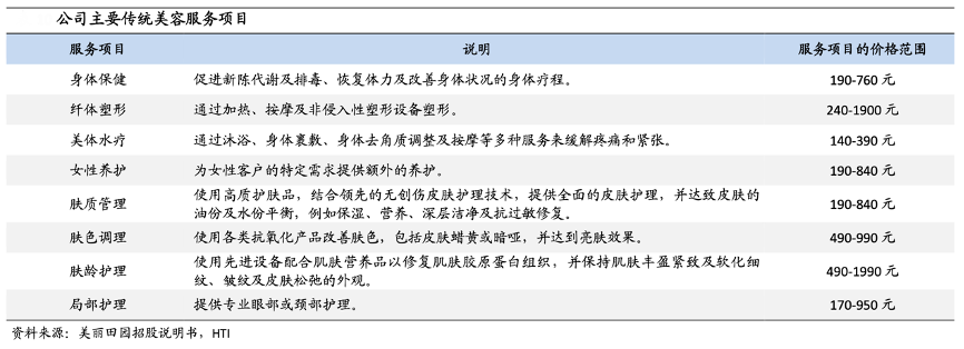 經(jīng)典案例:根據(jù)美麗田園招股說明書、HTI等綜合資訊表明,截至 2022 年 12 月 20 日,美麗田園公司提供 31 種傳統(tǒng)美容服務(wù)項目,涵蓋超過 130 個 SKU,包括身體保健、纖體塑形、美體水 療、膚質(zhì)管理、膚色調(diào)理等項目,服務(wù)項目的價格范圍不超過 2000 元,大部分項目集中在 1000 元以下,下表載列公司于往績記錄期間的主要傳統(tǒng)美容服務(wù)項目: