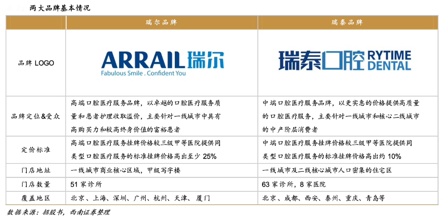 經(jīng)典案例:根據(jù)招股書、西南證券等綜合資訊表明,針對不同消費群體需求,瑞爾集團(tuán)將業(yè)務(wù)板塊拆分成針對一線及新一線富裕消費者的高端口腔醫(yī)療服 務(wù)——瑞爾牙科和為華北、華東、華南以及西區(qū)一線和核心二線城市中產(chǎn)階層服務(wù)的中端口腔服務(wù)瑞泰口腔。截至 2022 年 9 月 30 日,全國共有 51 家瑞爾診所,主要分布在北京、上海、深圳、廣州、杭州、天津和廈門七個城市。
