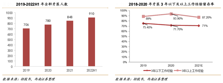 經(jīng)典案例:根據(jù)招股書、西南證券等綜合資訊表明,瑞爾公司通過多種途徑招募牙 醫(yī),包括在中國北京大學(xué)口腔醫(yī)學(xué)院、四川大學(xué)華西口腔醫(yī)學(xué)院和首都醫(yī)科大學(xué)等一流口腔醫(yī)學(xué)院進(jìn)行校園招聘,同時利用橫向招聘,主要自公立醫(yī)院聘 請富有才干的牙醫(yī),醫(yī)生總?cè)藬?shù)從 2019 年的 706 人增加至 2022 年 9 月的 910 人。超過 46.8%的全職牙醫(yī)擁有碩士或以 上學(xué)位,208 名約 23.6%的全職牙醫(yī)擁有超過 15 年的牙科從業(yè)經(jīng)驗;132 名或 15.0%的全 職牙醫(yī)擁有 10 年至 15 年的牙科從業(yè)經(jīng)驗。全職牙醫(yī)團(tuán)隊平均擁有 10.4 年的行業(yè)經(jīng)驗。