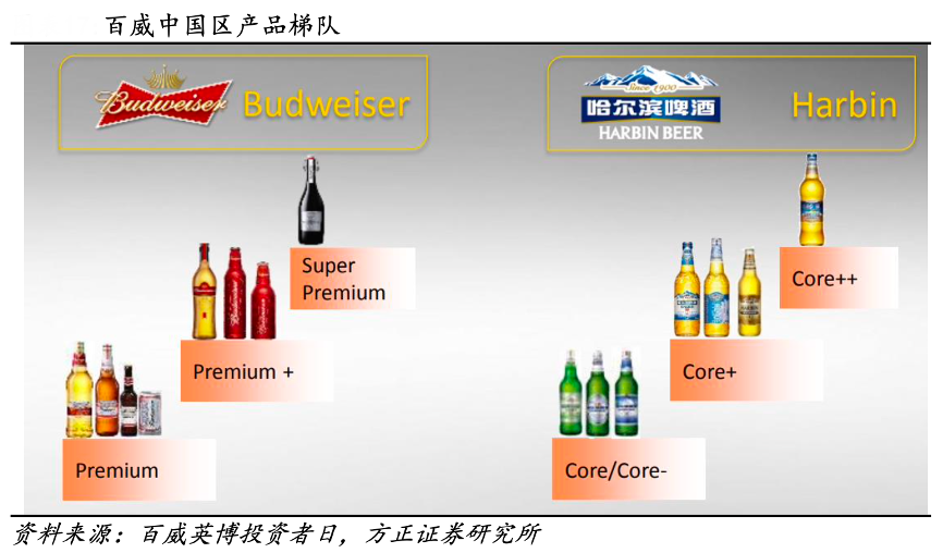 經(jīng)典案例:根據(jù)百威英博投資者日、方正證券研究所等綜合資訊表明,百威亞太“升級包裝+推出創(chuàng)新性產(chǎn)品”推動高端化,公司通過推動哈爾濱冰純(2006 年推出)在哈爾濱啤酒家族(清爽、冰暢、冰爽定位核心價格帶)中占比提升來推動核心到核心+價格帶的升級。公司 12H1 到 15H1 整體均價提升 CAGR +9%,90%由產(chǎn)品結構變動貢獻;10%由提價貢獻。