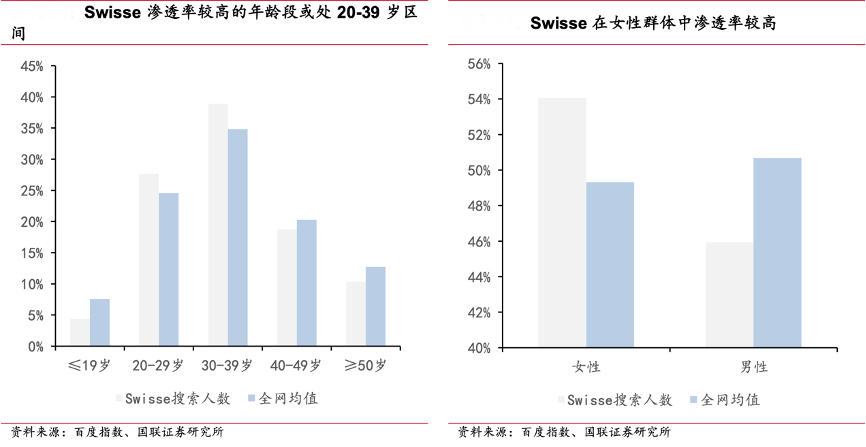 經(jīng)典案例:根據(jù)百度指數(shù)、國聯(lián)證券研究所等綜合資訊表明, Swisse主要客群畫像或為 20-39 歲區(qū)間女性消費者,口服美容系列貼近主要客群需求,產(chǎn)品定位上更細分,如鎖水補水的“水光瓶”、打造輪廓線的“超光瓶等,終端表現(xiàn)較為突出,23Q4上市的超光瓶在 2023 年雙十一期間 GMV 高達 776 萬,超光瓶、膠原水光瓶銷量位居全平臺第一。
