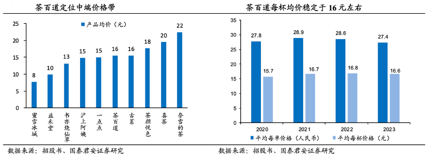 經(jīng)典案例:根據(jù)招股書、國(guó)泰君安證券研究等綜合資訊表明,茶百道定位中端價(jià)格帶,性價(jià)比優(yōu)勢(shì)顯著。茶百道每杯均價(jià)穩(wěn)定在 16 元左右, 原材料環(huán)節(jié)嚴(yán)格把控,多為原葉和鮮果,產(chǎn)品力穩(wěn)定。