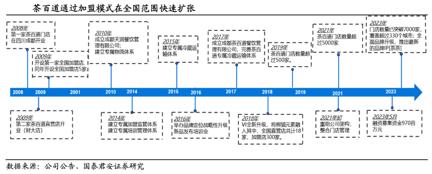 經(jīng)典案例:根據(jù)公司公告、國泰君安證券研究等綜合資訊表明,茶百道 2008 年誕生于成都,通過加盟模式在全國范圍快速擴(kuò)張。2019 年至 2021 年,在茶飲連鎖加盟浪潮下,茶百 道門店數(shù)量從 500 多家快速增長至超過 5000 家。2023 年 6 月,茶百道 完成新一輪融資,募資約 10 億元資金,領(lǐng)投方為蘭馨亞洲,跟投方包括 正心谷、草根知本、中金、番茄資本,投后估值接近 180 億元。