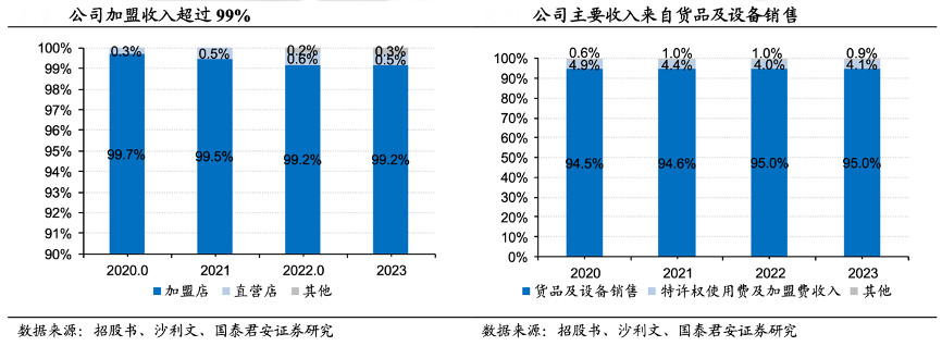 經(jīng)典案例:根據(jù)招股書、沙利文、國泰君安證券研究等綜合資訊表明,茶百道公司主要收入來源為向加盟店銷售貨品及設(shè)備,加盟收入占比超99%。茶百道的收入主要是銷售貨品及設(shè)備,即向加盟店銷售乳制品、茶葉及水果等制作茶飲的材料及配料、以及包材及門店設(shè)備,2023年占比 95.0%。
