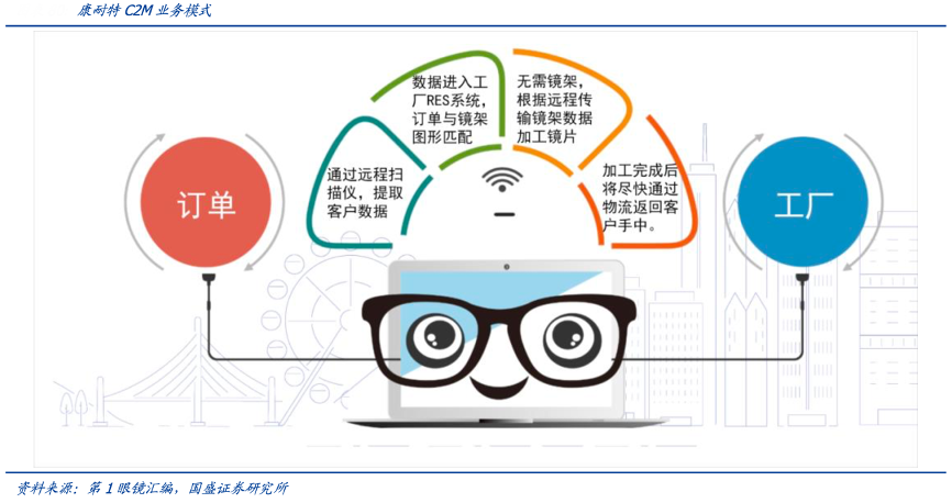 經(jīng)典案例:根據(jù)第1眼鏡匯編、國(guó)盛證券研究所等綜合資訊表明,康耐特光學(xué)依托 C2M 新業(yè)態(tài)模式滿足終端客戶一站式需求。C2M 模式指工廠直面終端銷售,主要客戶為眼科醫(yī)院/眼鏡店/診所/連鎖店/大型商超/在線網(wǎng)店。公司遠(yuǎn)程系統(tǒng)建設(shè)完善,用戶在線訂單系統(tǒng)下單后,信息直接傳輸至公司軟件&生產(chǎn)設(shè)備;同時(shí)也可以和客戶自有系統(tǒng)打通,提升客戶下單便捷性&交付效率。