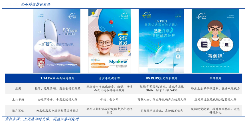經(jīng)典案例:根據(jù)上??的吞毓鈱W、國盛證券研究所等綜合資訊表明,康耐特光學公司依托強大的技術(shù)研發(fā)、供應鏈定制化&柔性化生產(chǎn)能力,持續(xù)擴充多元化產(chǎn)品矩陣,新品包括 1.74 Fix 雙曲面減薄鏡片、針對青少年近視防控推出的兒童離焦鏡片、UV PLUS 藍光防護鏡片、成人多點漸進產(chǎn)品等。