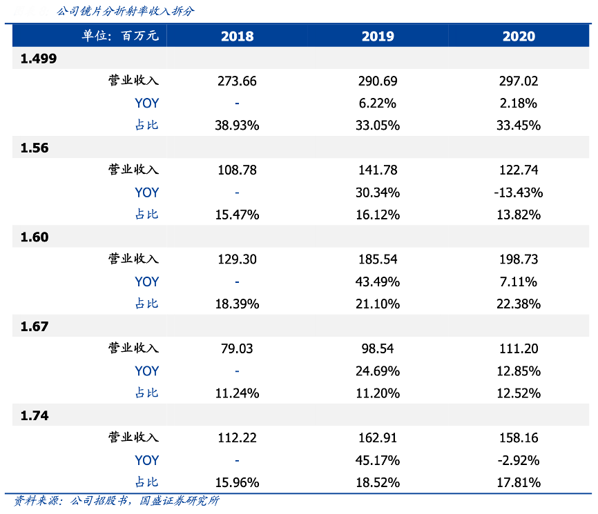 經(jīng)典案例:根據(jù)公司招股書、國(guó)盛證券研究所等綜合資訊表明,耐特光學(xué)高折射率鏡片占比穩(wěn)步提升,高端化趨勢(shì)明確。公司鏡片覆蓋 1.499-1.74 折射率范圍,2020年 1.499/1.56/1.60/1.67/1.74 折射率鏡片收入占比分別為 33.5%/13.8%/22.4%/12.5%/17.8% , 2018-2020 年 CAGR 分 別 為 4.2%/6.2%/24.0%/18.6%/18.7%,高折射率鏡片增速快于整體。