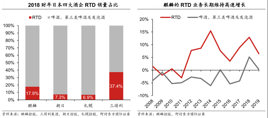 經(jīng)典案例:根據(jù)麒麟控股、三得利集團、朝日控股、札幌控股、野村東方國際證券等綜合資訊表明,2019財年,RTD 市場龍頭三得利和麒麟的 RTD 銷量分別占與啤酒/替代型低價啤酒(發(fā)泡酒及第三類啤酒)總銷量的37.4%及 17.9%,成為其業(yè)務環(huán)節(jié)中極為重要的一部分。以麒麟為例,在其啤酒/替代型低價啤酒業(yè)務銷量持續(xù)下滑的情形下,RTD 的銷量保持了較高增速。