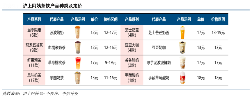 經(jīng)典案例:根據(jù)滬上阿姨Go小程序、中信建投等綜合資訊表明,自首創(chuàng)性提出五谷茶飲的概念后,滬上阿姨創(chuàng)新性將水果酸奶引入茶飲賽道、創(chuàng)新性開創(chuàng)五谷水果茶系列,持續(xù)引領(lǐng)五谷茶品類創(chuàng)新。其現(xiàn)有產(chǎn)品包含現(xiàn)煮五谷茶、鮮果沏茶、風(fēng)味奶茶、芝士奶蓋、手作酸奶等系列,整體產(chǎn)品價(jià)格區(qū)間設(shè)置在 9-19 元。