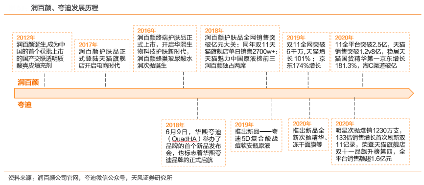 經(jīng)典案例:根據(jù)潤百顏公司官網(wǎng)、夸迪微信公眾號(hào)、天風(fēng)證券研究所等綜合資訊表明,2017 年 2 月,潤百顏?zhàn)o(hù)膚品正式登陸天貓旗艦店,一經(jīng)銷售獲得廣泛市場好評(píng),僅用約一年時(shí) 間就突破 1 億元銷售額大關(guān)。2018 年 12 年,故宮博物院與華熙生物聯(lián)名推出“故宮口紅”。 截至 2020 年,潤百顏始終保持高速增長,雙十一穩(wěn)居天貓國貨精華第一。