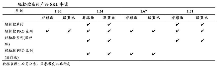 經(jīng)典案例:根據(jù)公司公告、國泰君安證券研究等綜合資訊表明,明月鏡片公司截至目前零售渠道共有 12 個(gè) SKU,醫(yī)療渠道共有 8 個(gè) SKU,公司在近視管理鏡片品類已有合計(jì) 20 個(gè) SKU 同時(shí)在售,在產(chǎn)品線豐富度方面繼續(xù)保持明顯領(lǐng)先。