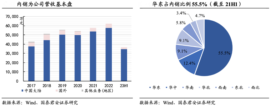 經(jīng)典案例:根據(jù)wind、國(guó)泰君安證券研究等綜合資訊表明,國(guó)內(nèi)市場(chǎng)消費(fèi)者基數(shù)大、市場(chǎng)培育成熟、下游需求穩(wěn)定,因此國(guó)內(nèi)業(yè)務(wù)是明月鏡片公司的基本盤(pán),2020-2022 年國(guó)內(nèi)中國(guó)大陸地區(qū)收入占比 90%+。國(guó)內(nèi)市場(chǎng)分地區(qū)看,截至 21H1, 華東/華中/華南/華北地區(qū)收入占內(nèi)銷(xiāo)收入比例分別為 55.5%/12.4%/9.1%//9.1%,華東地區(qū)是主力市場(chǎng),內(nèi)銷(xiāo)收入份額超50%。