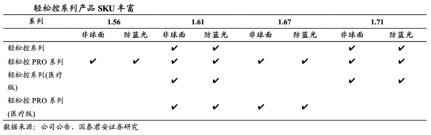 經(jīng)典案例:根據(jù)公司公告、國(guó)泰君安證券研究等綜合資訊表明,明月鏡片公司于 2022 年發(fā)布具有雙重防藍(lán)光功能的近視防控鏡片新產(chǎn)品,2023 年發(fā)布 1.56pro 和 1.56pro 防藍(lán)光。截至目前零售渠道共有 12 個(gè) SKU,醫(yī)療渠道共有 8 個(gè) SKU,公司在近視管理鏡片品類(lèi)已有合計(jì) 20 個(gè) SKU 同時(shí)在售,在產(chǎn)品線豐富度方面繼續(xù)保持明顯領(lǐng)先。