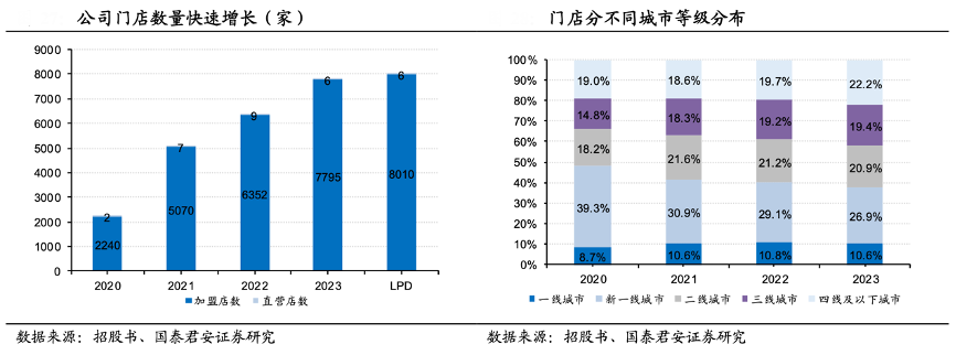 經(jīng)典案例:根據(jù)招股書(shū)、國(guó)泰君安證券研究等綜合資訊表明,茶百道通過(guò)加盟模式建立覆蓋全國(guó) 31 個(gè) 省市的廣泛的門(mén)店網(wǎng)絡(luò),截至 2023 年 12 月 31 日,茶百道門(mén)店數(shù)量共 7801 家,含 7795 家加盟店。同時(shí)截至 2023 年底,一線、新一線、二線、三線、四線及以下城市門(mén)店數(shù)量分別占茶百道門(mén)店總數(shù)的 10.6%、26.9%、20.9%、19.4%及 22.2%,其中新一線城市門(mén)店數(shù)量占比最高。