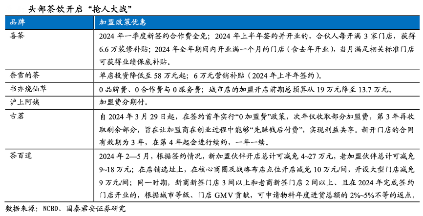 經(jīng)典案例:根據(jù)NCBD、國(guó)泰君安證券研究等綜合資訊表明,2024年以來(lái),頭部連鎖茶飲品牌通過(guò)調(diào)整加盟政策,進(jìn)一步降低加盟門(mén)檻,開(kāi)啟“搶人大戰(zhàn)”。頭部品牌發(fā)力爭(zhēng)奪市場(chǎng)份額,有望憑借規(guī)模優(yōu)勢(shì)、供應(yīng)鏈能力以及運(yùn)營(yíng)能力加速尾部 獨(dú)立茶飲店出清。