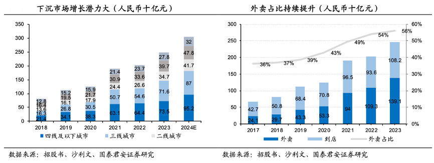 經(jīng)典案例:根據(jù)招股書(shū)、沙利文、國(guó)泰君安證券研究等綜合資訊表明,隨著外賣(mài)平臺(tái)和應(yīng)用程序的普及,尤其年輕人生活方式和用餐偏好的改變,茶飲外賣(mài)滲透率持續(xù)提升。國(guó)內(nèi)現(xiàn)制茶飲店市場(chǎng)通過(guò)外賣(mài)實(shí)現(xiàn)的零售額 已由 2018 年的人民幣 297 億元增至 2023 年的人民幣 1391 億元,年復(fù)合增長(zhǎng)率為 36.2%;2023 年,現(xiàn)制茶飲行業(yè)外賣(mài)滲透率達(dá)到 56.3%。