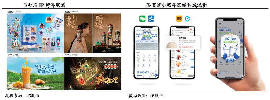 經(jīng)典案例:根據(jù)招股書、國(guó)泰君安證券研究等綜合資訊表明,數(shù)字化營(yíng)銷、IP 營(yíng)銷和品牌聯(lián)名建立茶百道強(qiáng)大的線上影響力。其通過(guò)微博、微信、小紅書、抖音、嗶哩嗶哩及快手等主流社交平臺(tái)獲客,通過(guò)抖音進(jìn)行線上直播和品牌營(yíng)銷吸引消費(fèi)者,抖音直播團(tuán)購(gòu)獲得“穩(wěn)居全國(guó)帶貨團(tuán)購(gòu)榜”、“茶飲品類直播 GMV”、“品牌專場(chǎng)轉(zhuǎn)化率”等多個(gè)行業(yè)第一。同時(shí)通過(guò)品牌 IP“茶茶”提升品牌形象,設(shè)計(jì)并推出“茶茶”表情包、“茶茶”特色創(chuàng)意商品,并與 KOL 及網(wǎng)紅進(jìn)行合作。