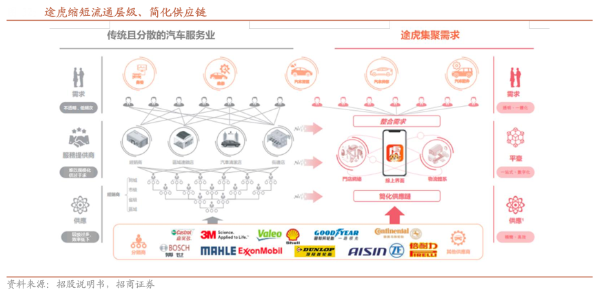 經(jīng)典案例:根據(jù)招股說(shuō)明書(shū)、招商證券等綜合資訊表明,區(qū)別于獲授權(quán)經(jīng)銷(xiāo)商的購(gòu)買(mǎi)鏈路(OEM體系,品牌商→主機(jī)廠→授權(quán)經(jīng)銷(xiāo)商,鏈路更長(zhǎng)且拿貨價(jià)更高),途虎通常直接向汽車(chē)零配件制造商或品牌商進(jìn)行采購(gòu),疊加途虎基于規(guī)模優(yōu)勢(shì)向供應(yīng)商取得有利條款,進(jìn)而實(shí)現(xiàn)突出的價(jià)格優(yōu)勢(shì)。據(jù)灼識(shí)咨詢,以機(jī)油高端品牌為例,途虎的拿貨價(jià)格通常比獲授權(quán)經(jīng)銷(xiāo)商平均采購(gòu)價(jià)格便宜 30%左右。