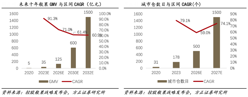 經(jīng)典案例:根據(jù)控股般果戰(zhàn)略發(fā)布會(huì)、方正證券研究所等綜合資訊表明,般果通過共享百果園的供應(yīng)鏈資源拓展上下游合作伙伴,并承接百果園水果標(biāo)準(zhǔn)體系、倉配物流、數(shù)字化建設(shè)、品牌打造、會(huì)員運(yùn)營(yíng)等能力,為交易上下游賦能,擴(kuò)大交易規(guī)模、提升市場(chǎng)滲透率。般果平臺(tái)未來十年目標(biāo)為陸續(xù)完成全國五大總倉、1500個(gè)城市倉的布局。同時(shí)GMV達(dá) 1500 億元。更向代采交易+行業(yè) 咨詢交互平臺(tái)轉(zhuǎn)化,并不斷優(yōu)化盈利模型。