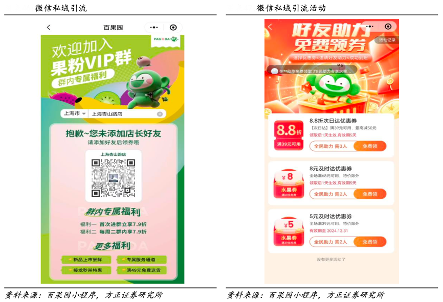 經(jīng)典案例:根據(jù)百果園小程序、方正證券研究所等綜合資訊表明,百果園推出了“到店自提”的運(yùn)營(yíng)模式以實(shí)現(xiàn)線(xiàn)上線(xiàn)下的流量循環(huán)。用戶(hù)從 各個(gè)觸點(diǎn)接觸到“到店自提”的優(yōu)惠活動(dòng),并下單購(gòu)買(mǎi)。在用戶(hù)到店后,門(mén)店工作人員會(huì)主動(dòng)拋出“買(mǎi)水果送回頭券”、“99 元入會(huì)”、“進(jìn)群搶福利”等優(yōu)惠活動(dòng),引導(dǎo)用戶(hù)添加企微好友。最后,引導(dǎo)用戶(hù)進(jìn)群,進(jìn)行欄目化、精細(xì)化管理,讓用戶(hù)能夠第一時(shí)間了解最新產(chǎn)品優(yōu)惠,促使用戶(hù)決策、購(gòu)買(mǎi)。