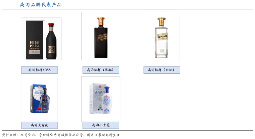 經(jīng)典案例:根據(jù)公司官網(wǎng)、今世緣官方商城微信公眾號(hào)、國(guó)元證券研究所等綜合資訊表明,高溝品牌2022年品牌重塑后,以新品標(biāo)樣開(kāi)啟新征程。公司 2022 年 8 月推出高溝標(biāo)樣 新品,定位黃淮名酒帶高線光瓶典范,其中高溝標(biāo)樣 1955 是高端形象產(chǎn)品,黑標(biāo)、白標(biāo)為主銷品,兩者中又以黑標(biāo)為先。